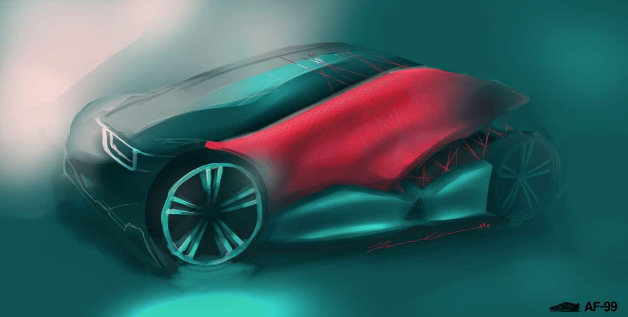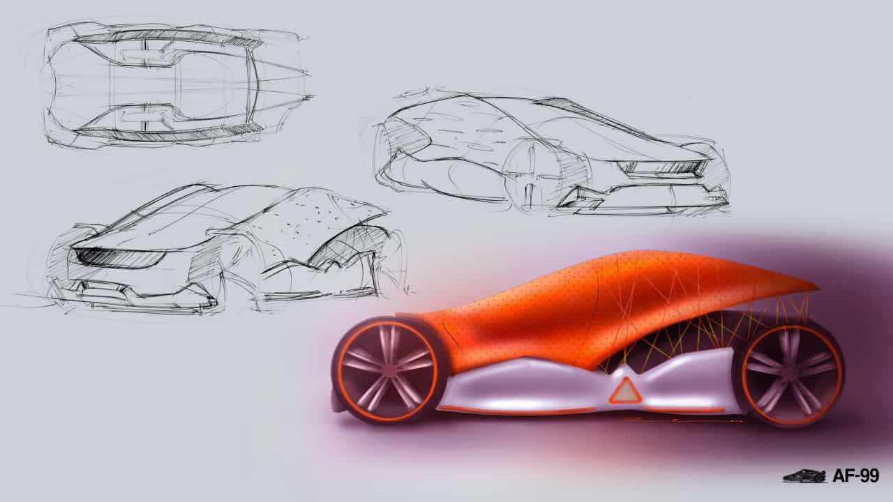 The BMW GINA concept and the Adidas Audi ‘the Kobe’ basketball shoe were two of main pieces of inspiration for Lumley’s project. The GINA showed that fabric could be used on a vehicle exterior and the Kobe basketball shoe was designed by Audi and incorporated the design language of the Audi TT at the time. The AF-99 concept incorporates both aesthetic form and breakthrough technology/materials from the footwear industry.
