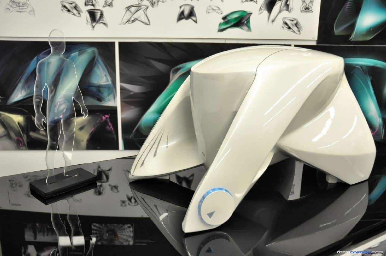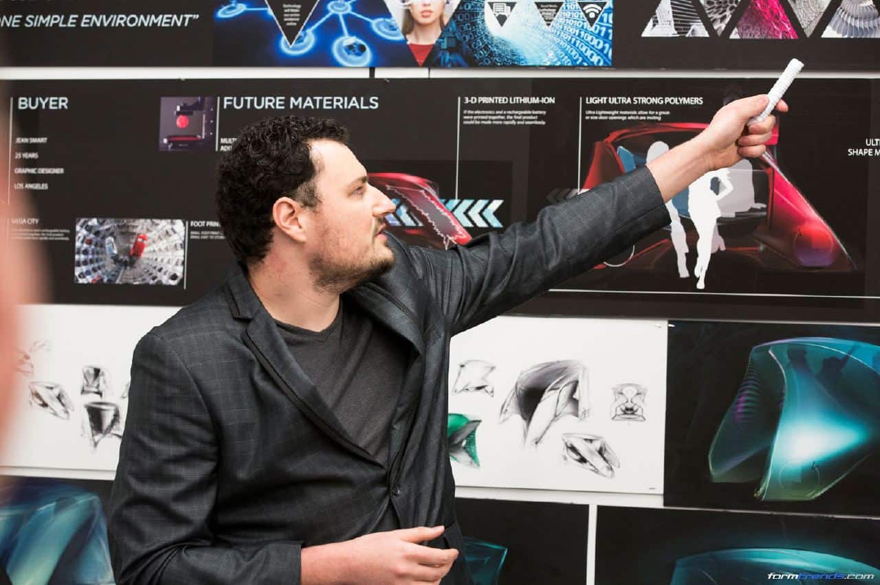 McCarthy was lauded for his concept’s flexing ‘live hinge’ door made of ultra-lightweight polymers; the personalized three passenger interior made of ultra-soft, flexible shape memory polymers; and freeform 3D-printed lithium ion batteries that employ thermoplastic materials so they could be mounted into the vehicle’s fenders and cooled.