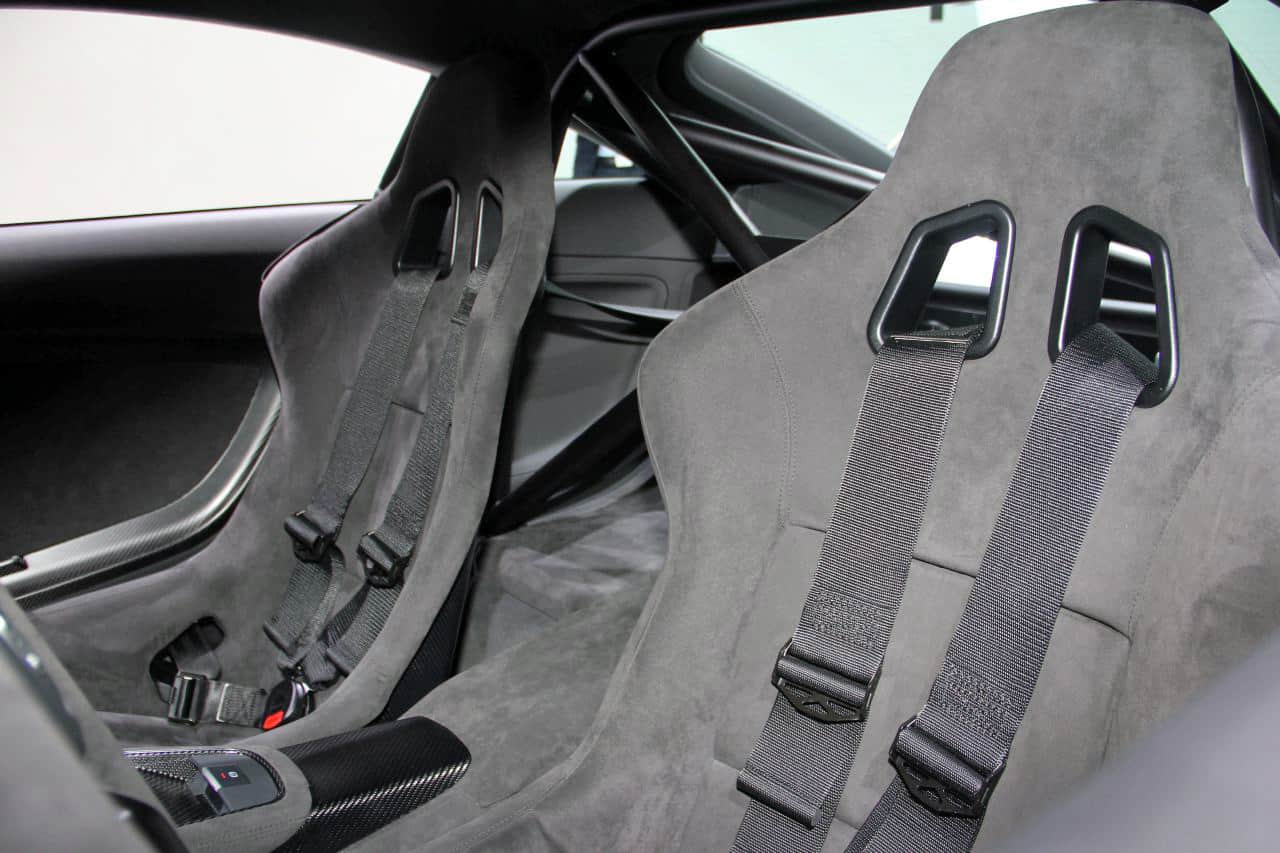 “Race thinking” was applied to the interior, says studio design director Marcus Berry. “We stripped everything out, then put it back together using carbon fiber elements, a rollcage and lightweight seats.” The interior was trimmed in Alcantara, a smaller flat-bottom steering wheel was fitted, four point safety belts were added and the rear seats were removed.