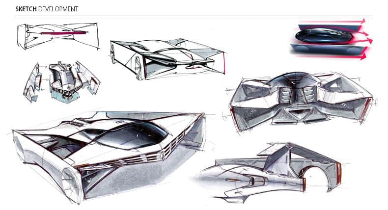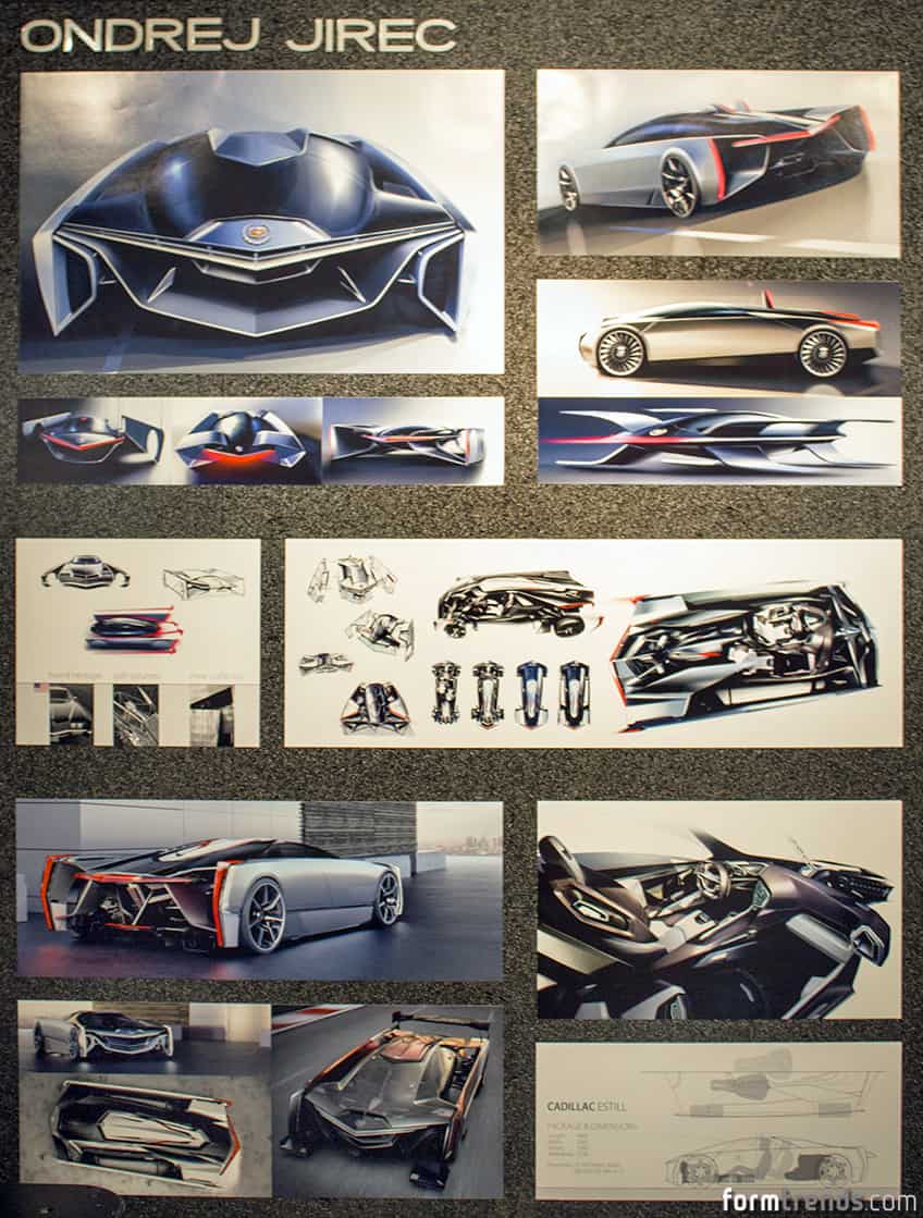 Our favorite was his Cadillac Estill supercar concept, which featured sheer sides and layered treatments on the front and rear fascia along with suspension and drivetrain components displayed like jewelry.