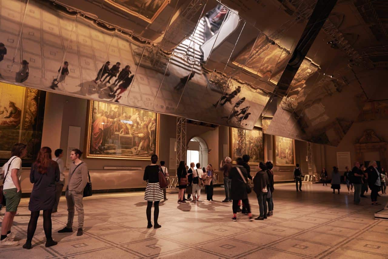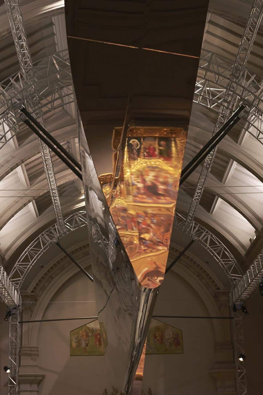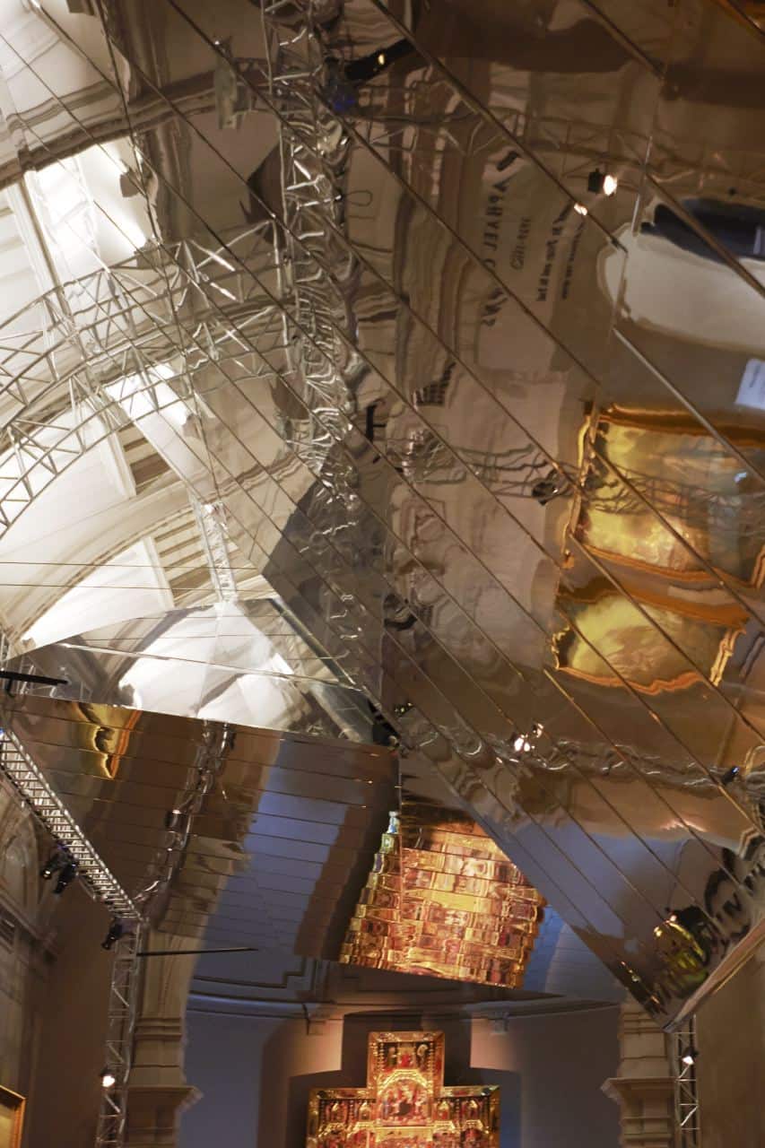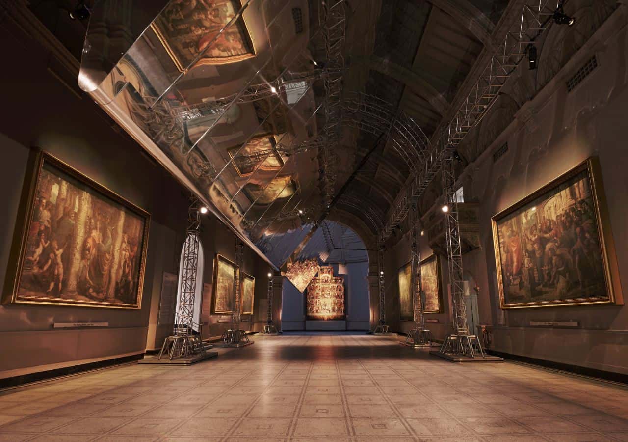 Two giant mirrors suspend in the centre of the gallery. The choreographed movement of these structures — flat on one side, curved on the other — distorts the view of the seven surviving designs for tapestries in the Sistine Chapel. The mirrors heighten the scale of the room too, together with the dim light adding even more drama.
