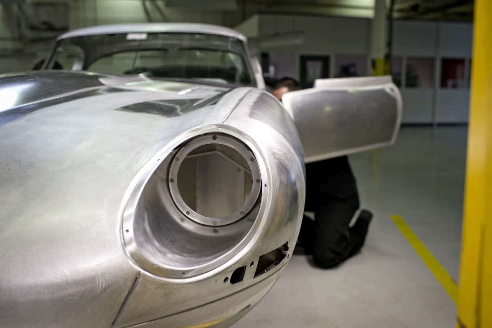 Thanks to the extensive use of aluminum in its construction, the Lightweight was approximately 114kg (250lb) lighter than a standard E-Type and featured a host of additional weight-saving features. It was devoid of interior trim, lacked the exterior chrome work and was fitted with hand-operated side windows.