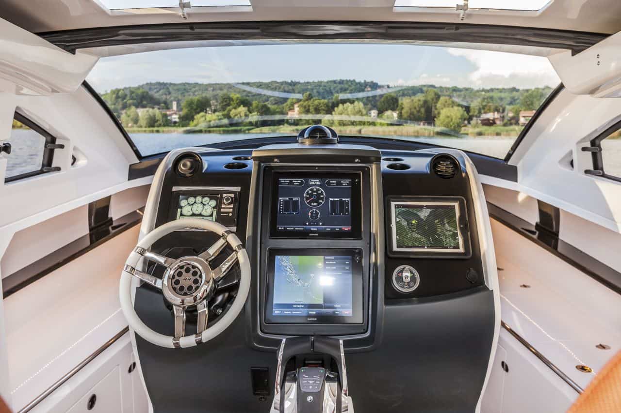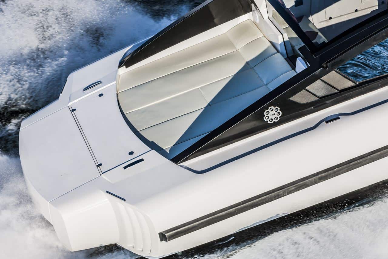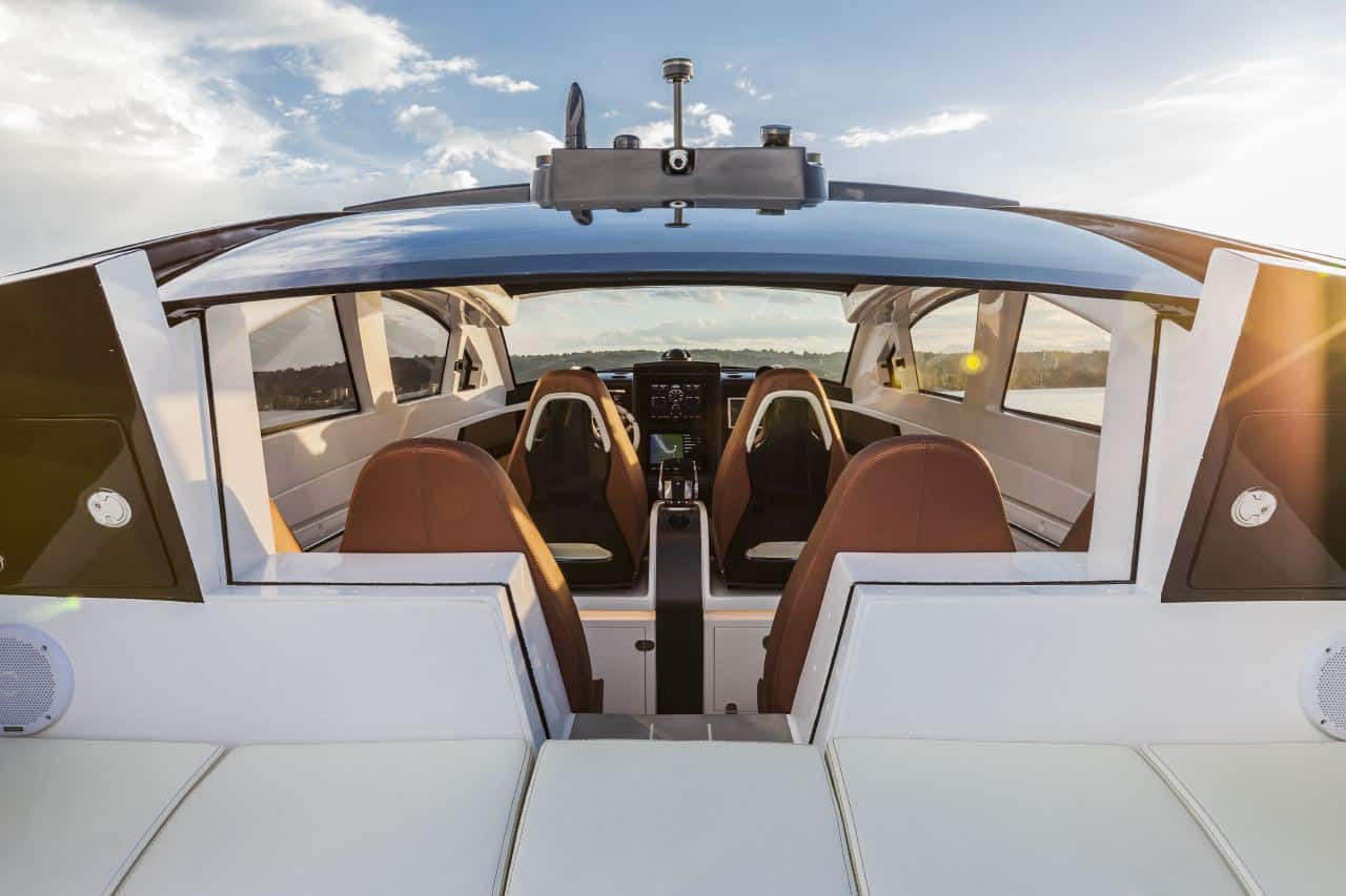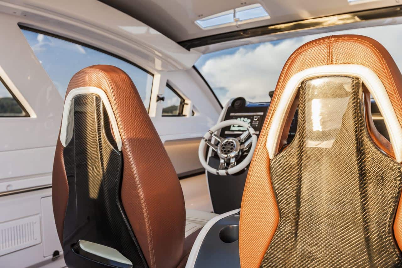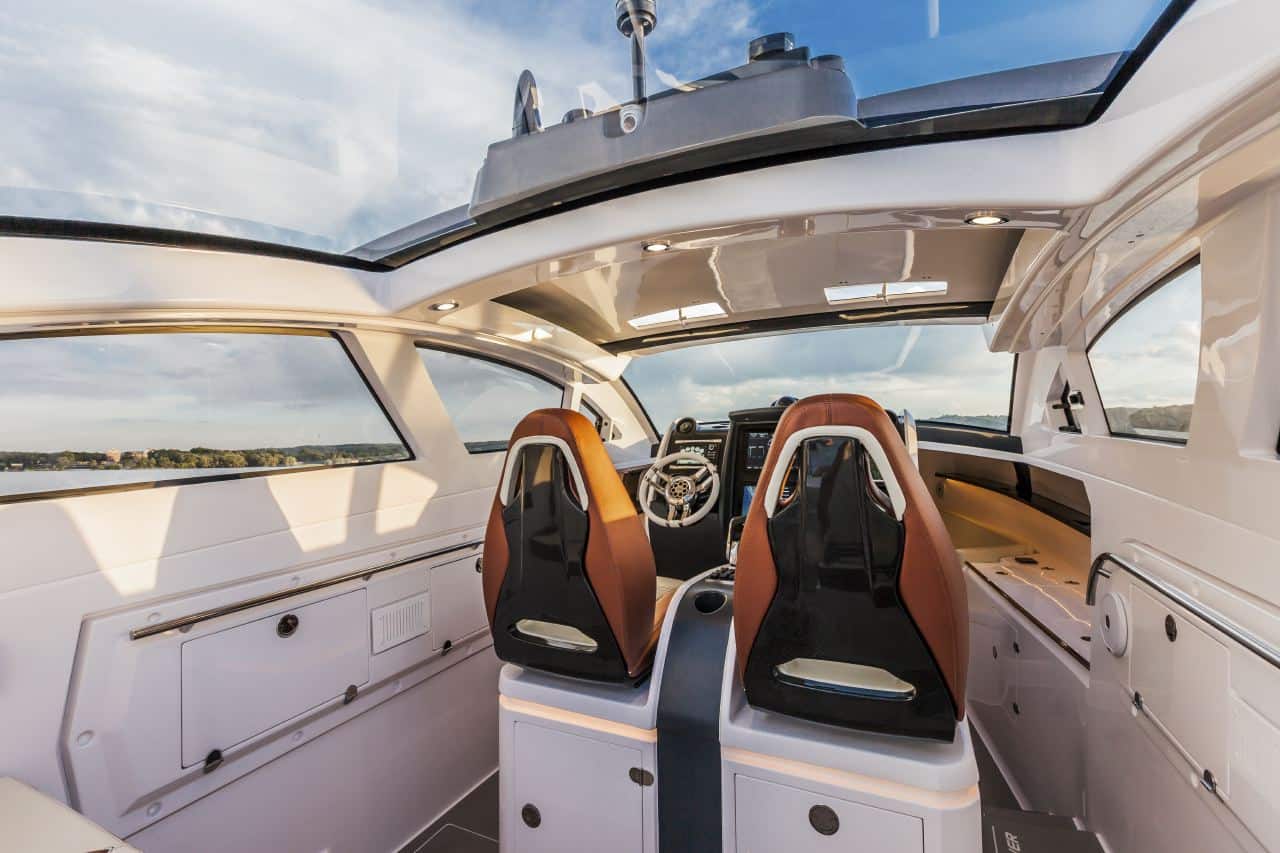 Four passenger seats behind the helm station pick up on the aesthetics of the captain and co-captain chairs. Other distinctive elements include a large, electronically operable glass roof as well as a rear glass door that opens up (hiding away in the engine room). The whole operation happens wirelessly and only takes a few seconds. The glass roof is opened and closed by remote control.