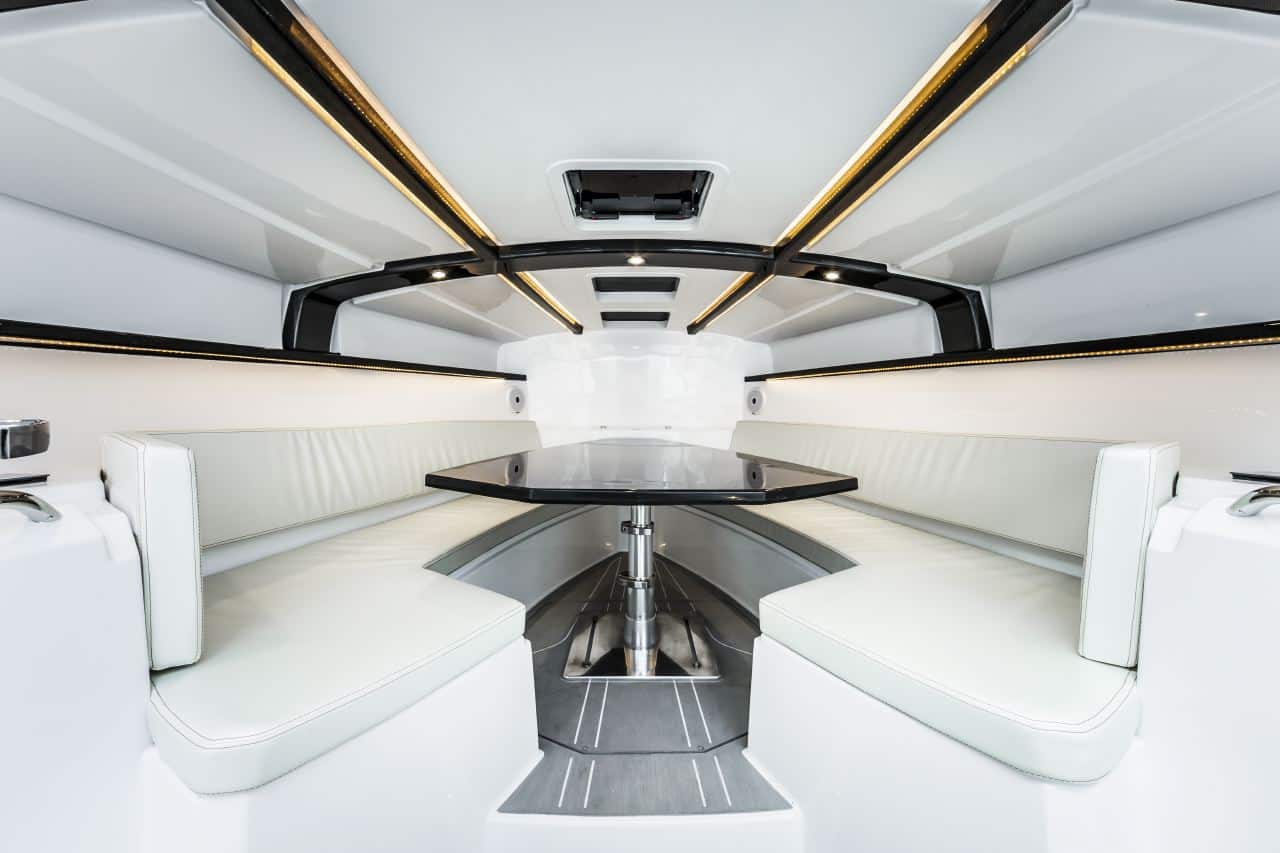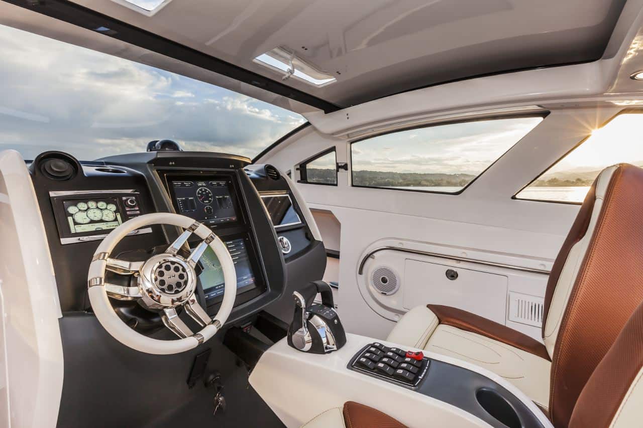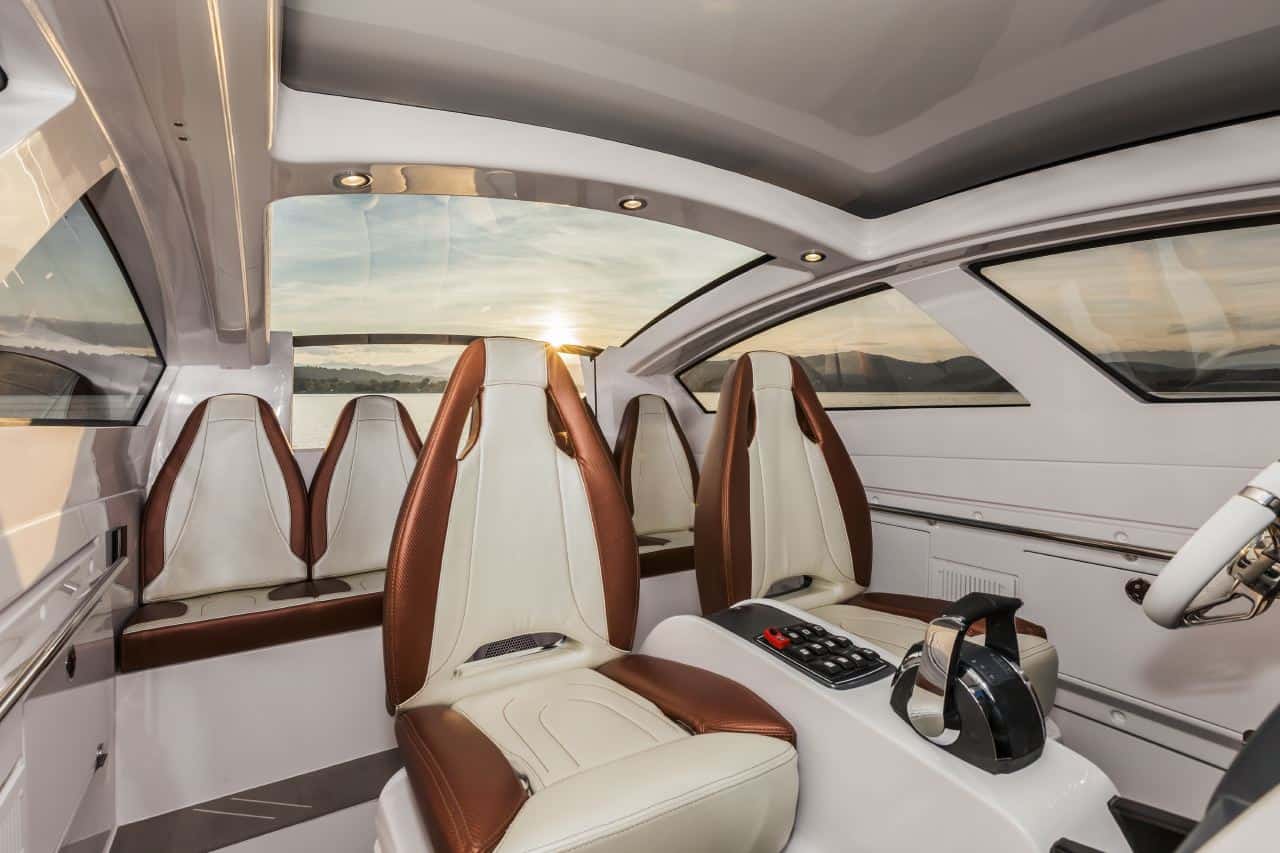 The interior layout focuses on the large central structure that houses the control panel and helm station. This has been significantly modified from the 42R — designed by Michael Peters Yacht Design — for a new sense of symmetry and sophisticated convenience, in true automotive style.