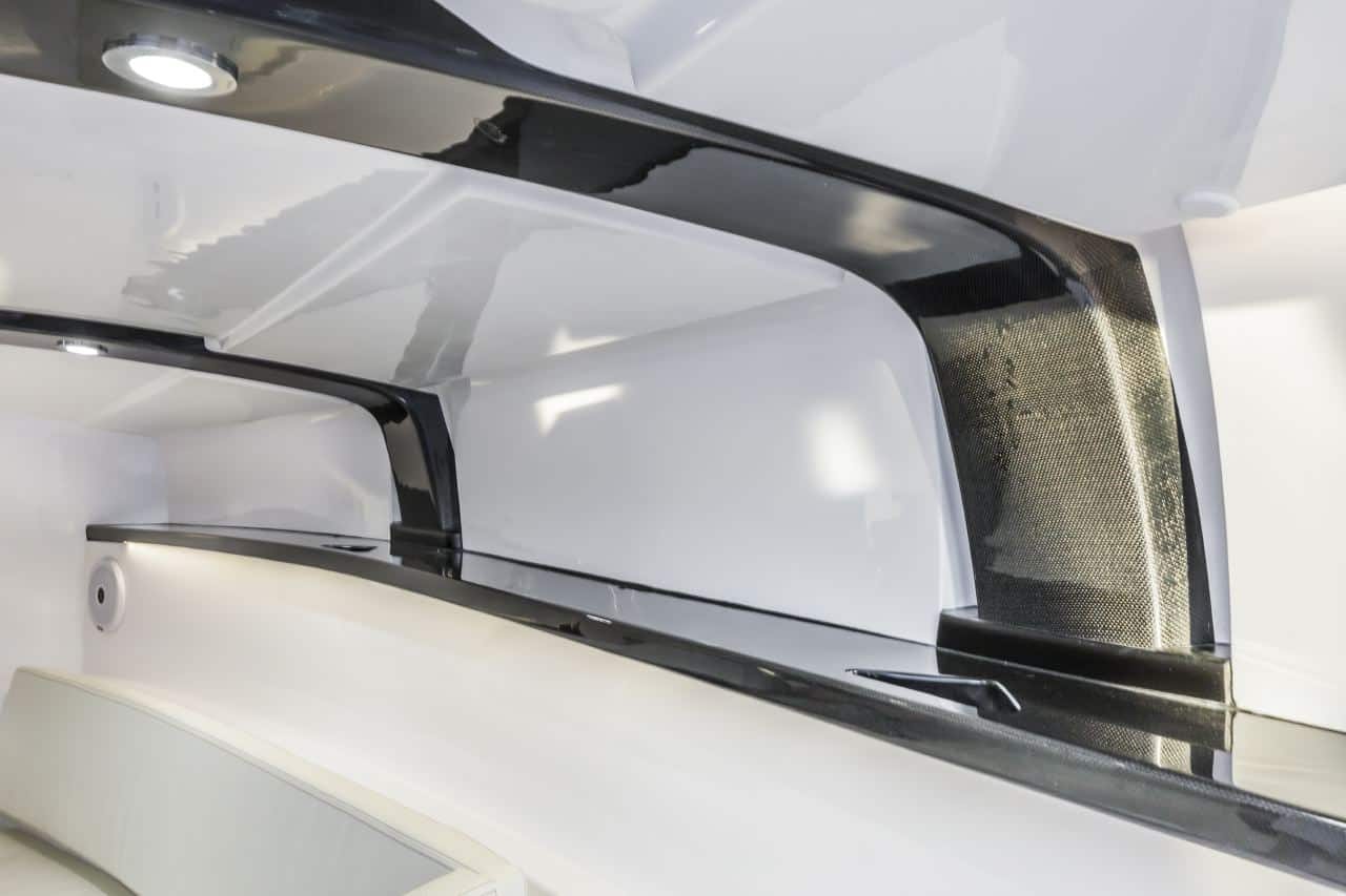 The hard top is made of structural carbon, with exposed bulkheads just like those found in elite cars. The blend of technology and aesthetics is also evident in the flooring, where Esthec (an environmentally friendly and almost maintenance free material) enables a dynamic edge design. The ‘smoke’ color also substantially reduces solar heat gain.