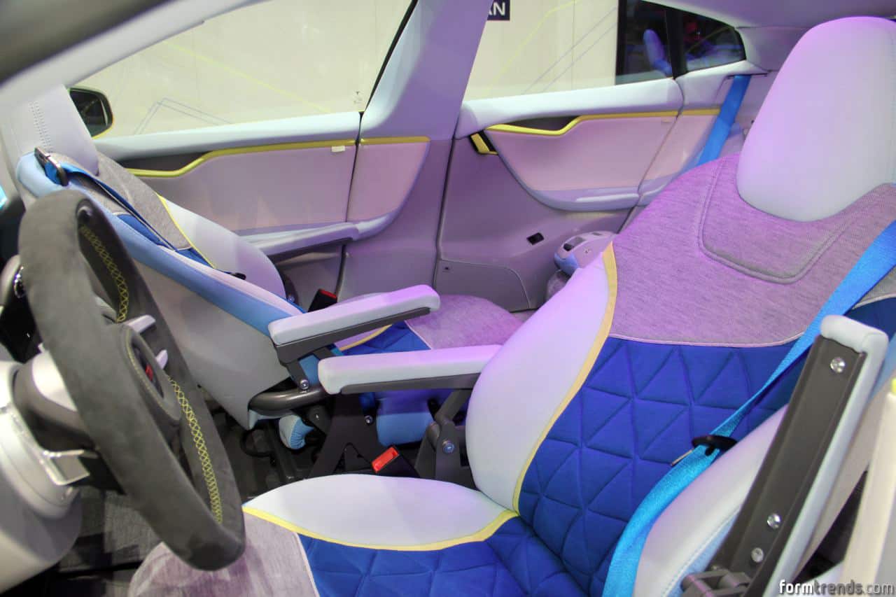 The XchangE is based on a Tesla Model S donor car, which was chosen because of its electric powertrain and flat floor. This enabled Rinderknecht’s partners to create a reconfigurable interior compete with seats that are reminiscent of those found in business-class accommodations on airliners.