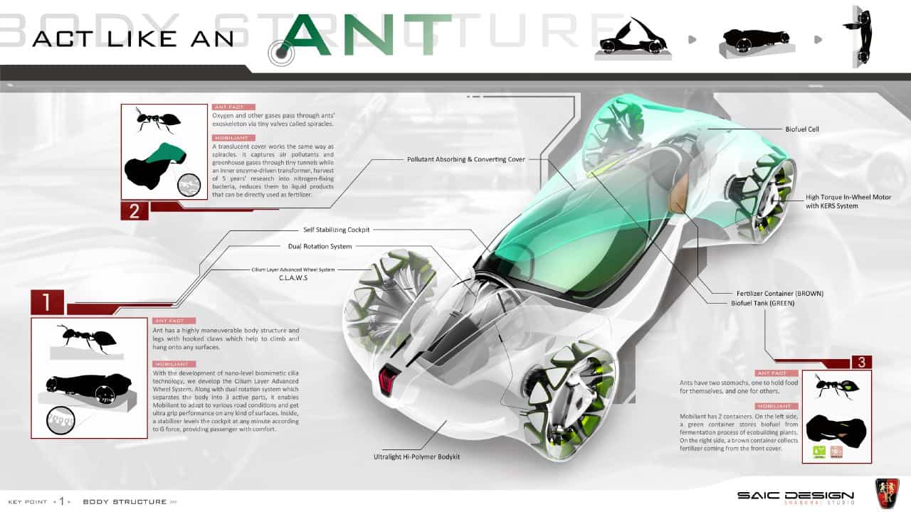 Entries were judged on various criteria: creative adaptation of nature’s laws (plants & animals); application of human intelligence to Biomimicry in unique ways to improve the efficiency of future vehicles; comfort, convenience, aesthetics of the vehicle; sustainability of the building, servicing, operation, and life cycle; and the personality of the vehicle.