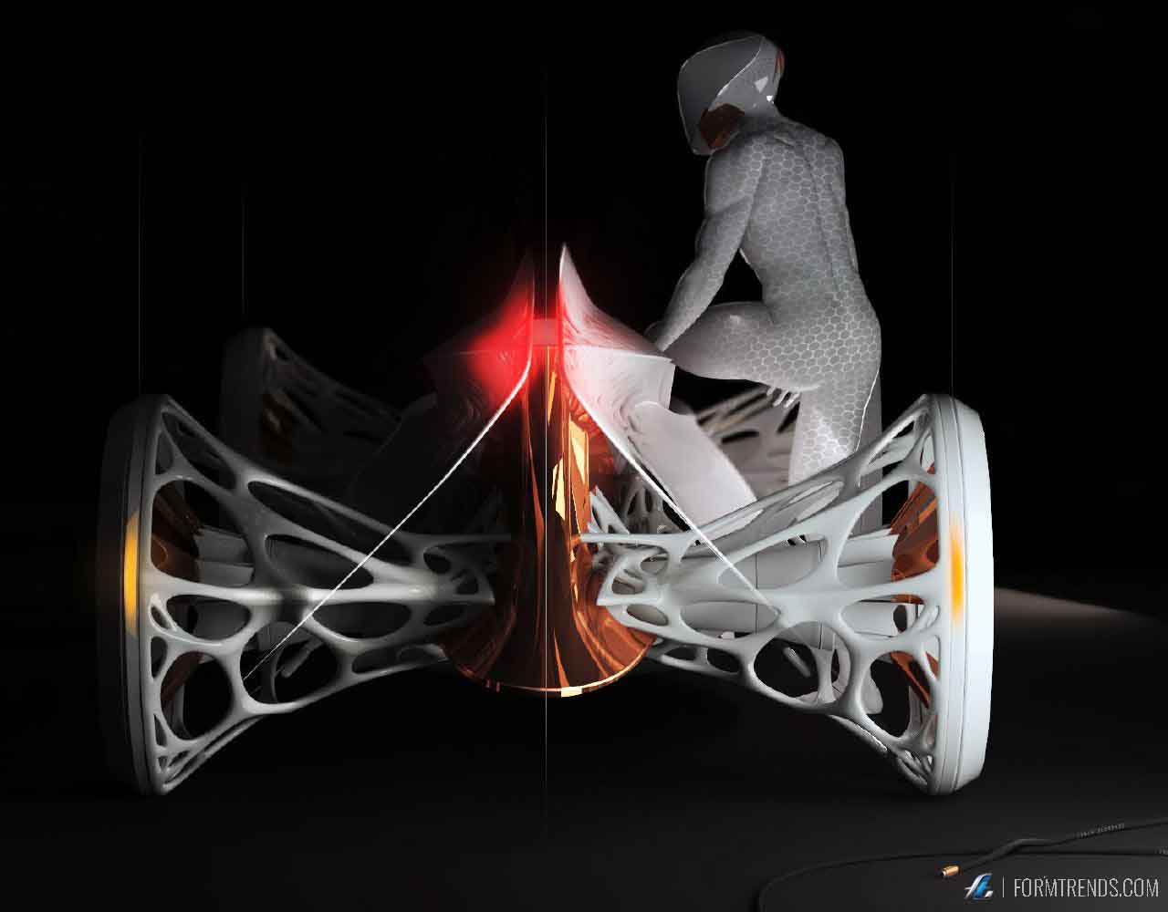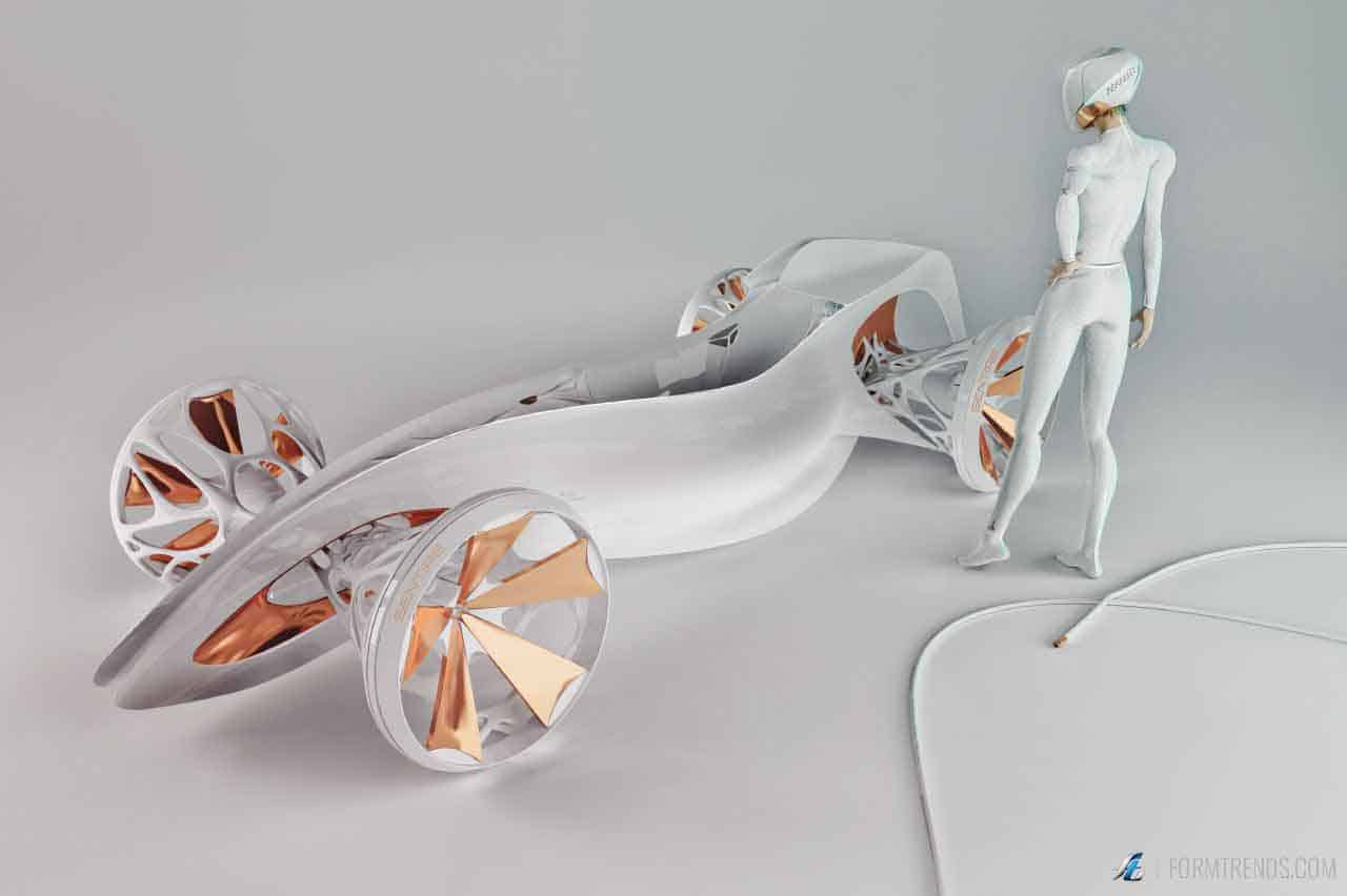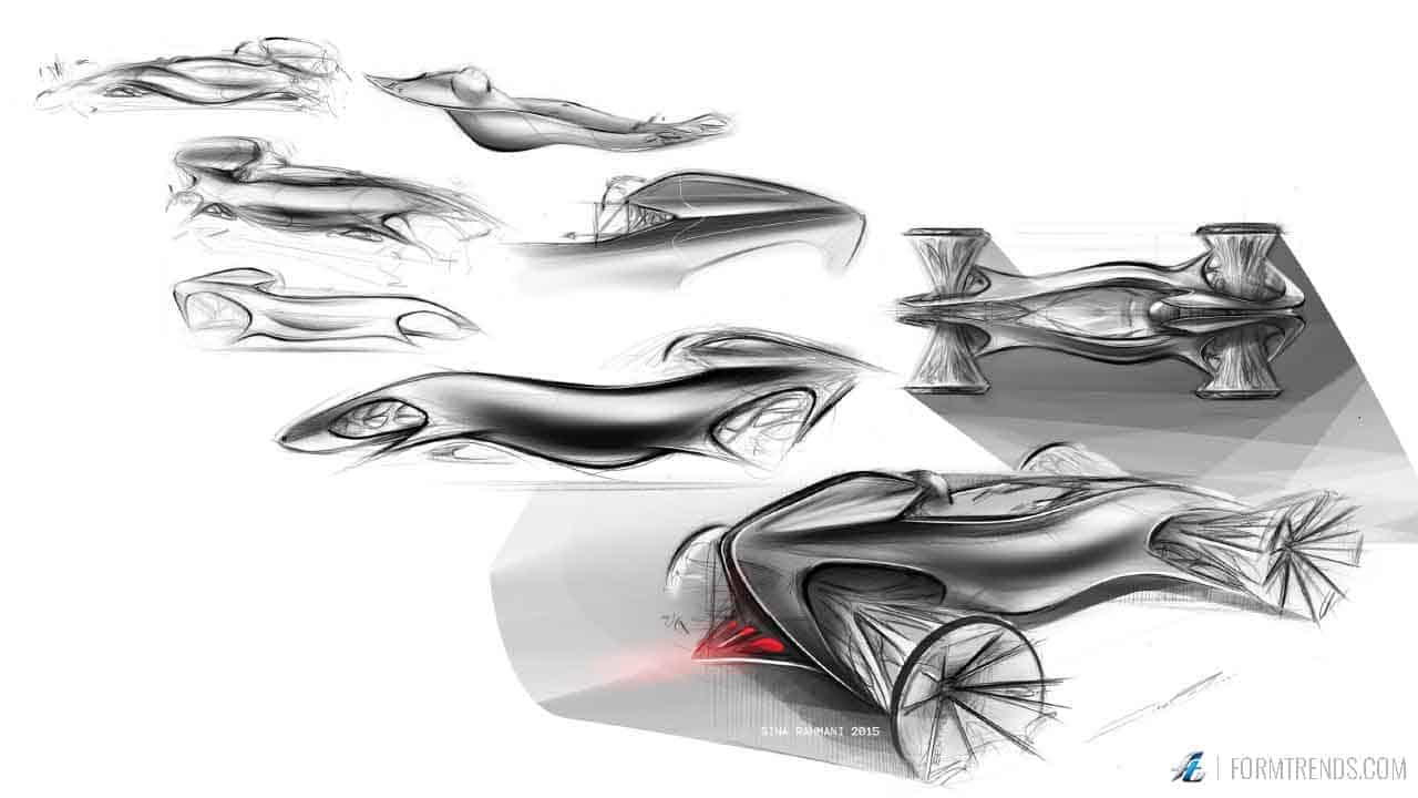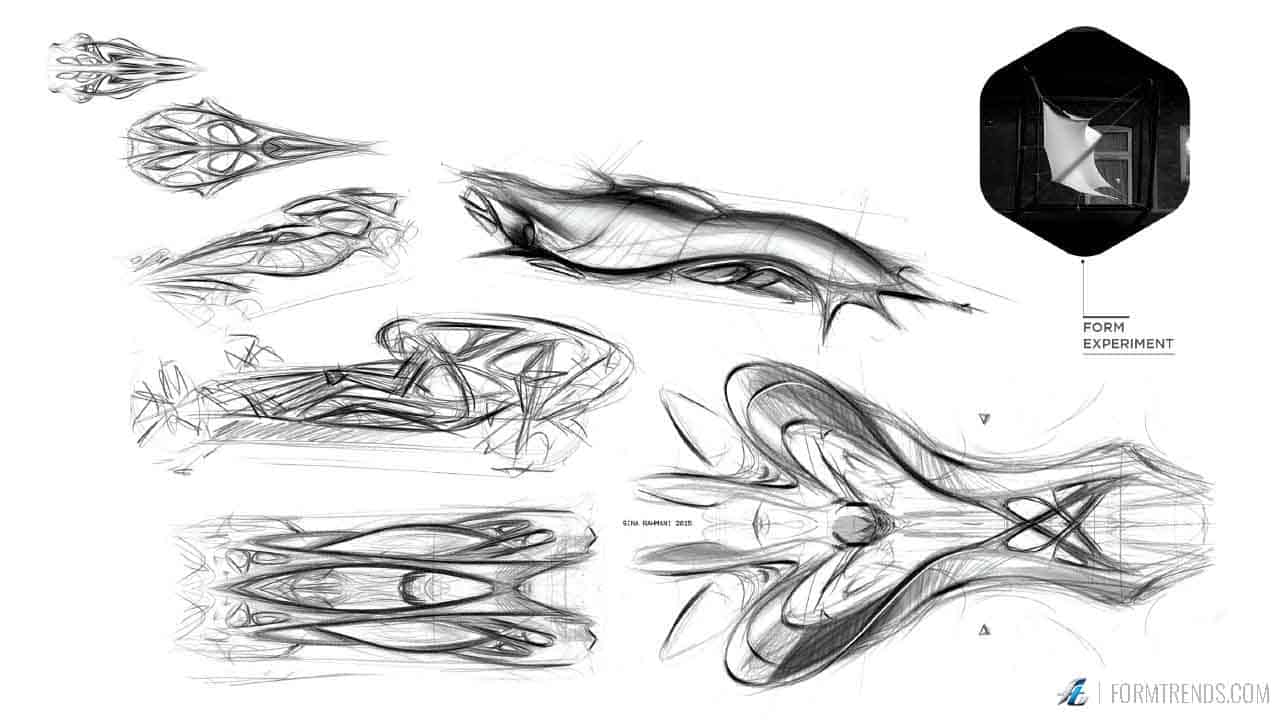 The design of the vehicle draws inspiration from biology, human form and parametric design. Rahmani researched the human body and conducted form experiments that involved stretching membranes to create a sense of softness and tension, which is incorporated into the design. This overall mixture creates an aesthetic that may be alien to automotive design, but familiar to nature.