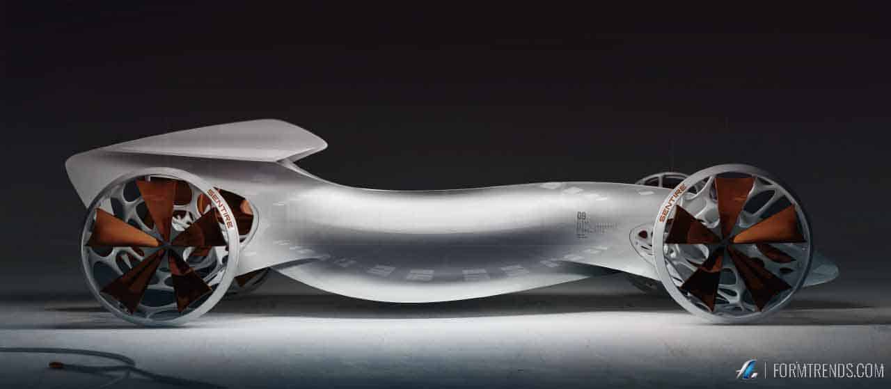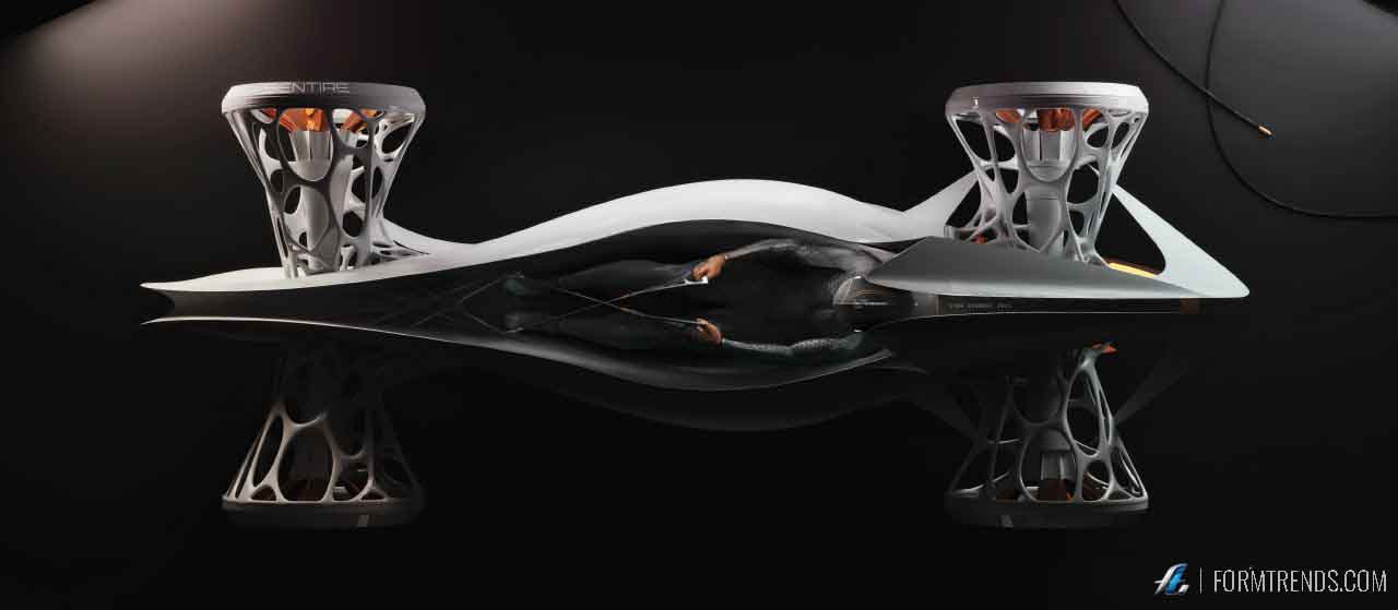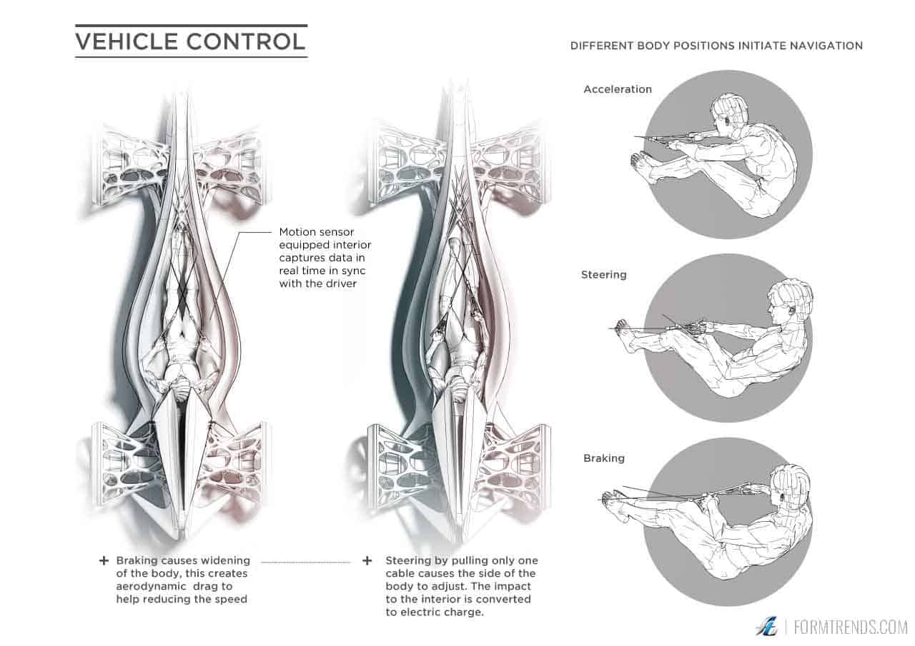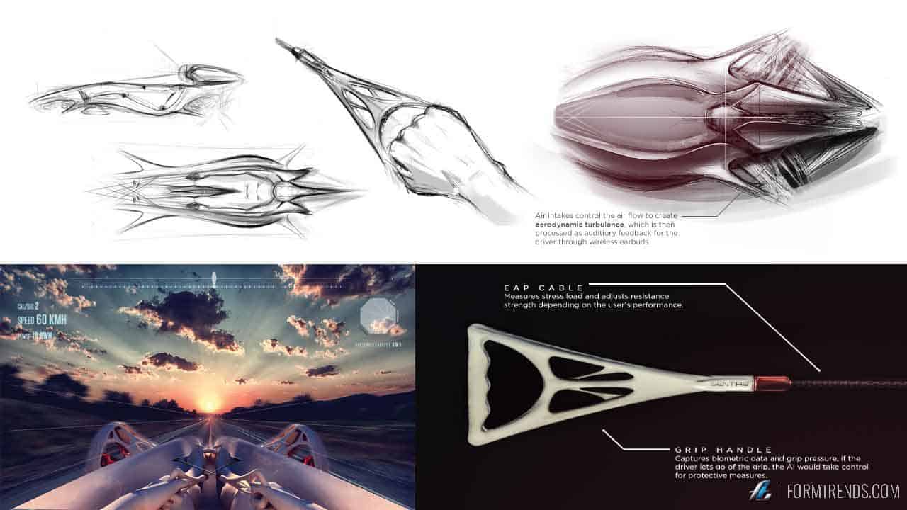 The Sentire concept takes driving as an experience to something purely athletic and physical to encourage wellbeing. As information technology grows exponentially, artificial intelligence becomes embedded in our hyper connected world, but how do we interact with it? The concept proposes a dynamic that encourages use of senses and motion by capturing biometric data through sensors and processing it with an advanced AI. As the driver moves inside the vehicle, its electroactive skin and structure adapts in sync with the driver.