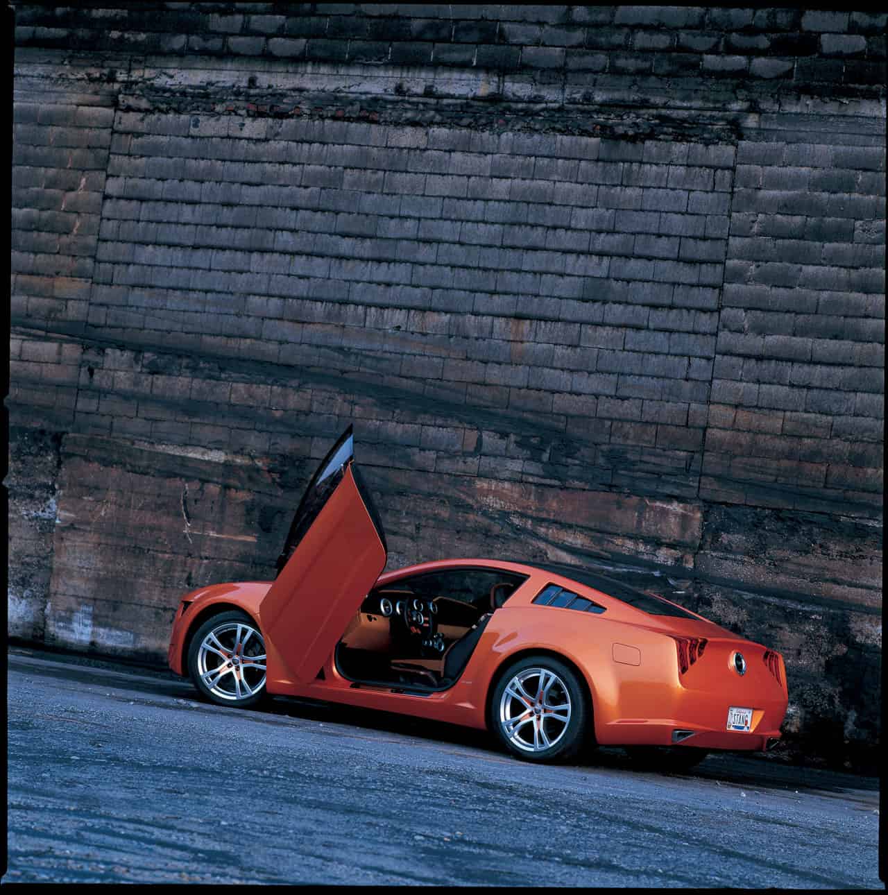 Visually, the Mustang by Giugiaro appeared more compact than the production car, thanks to a reduction of the rear overhang and a signature Giugiaro trick of tapering the angles on the car to the limit of its mechanical outlines. But the vibrant orange concept was actually 30mm wider at the front and 80mm wider at the rear, gradually expanding over the length of the car.