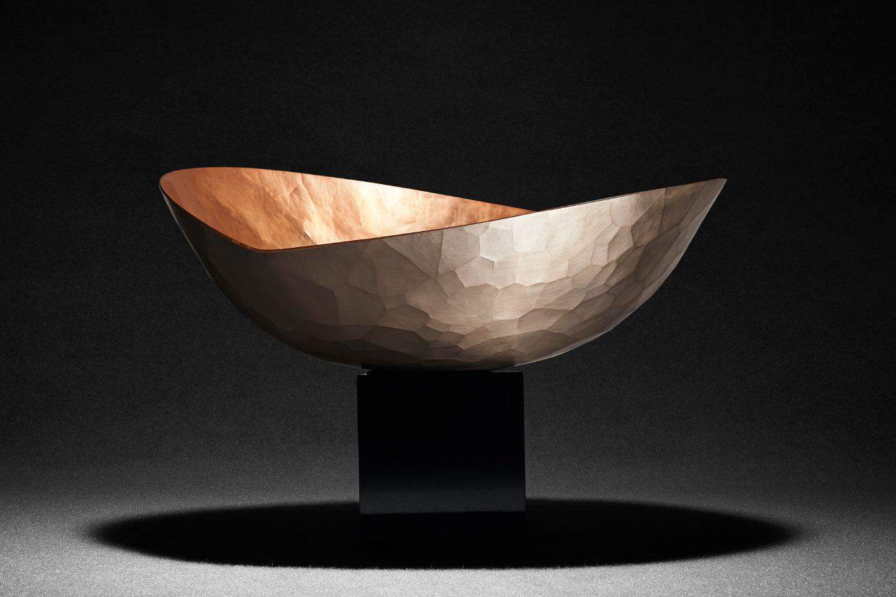 Elsewhere, two unassuming small objects represent another side of Kodo. Kodoki is a copper vase by studio Gyokusendo where artisans work in the ancient tsuiki method by beating the ingot into a thick sheet by hand, adding colour through a reaction between tin plate and compounds taken from nature.