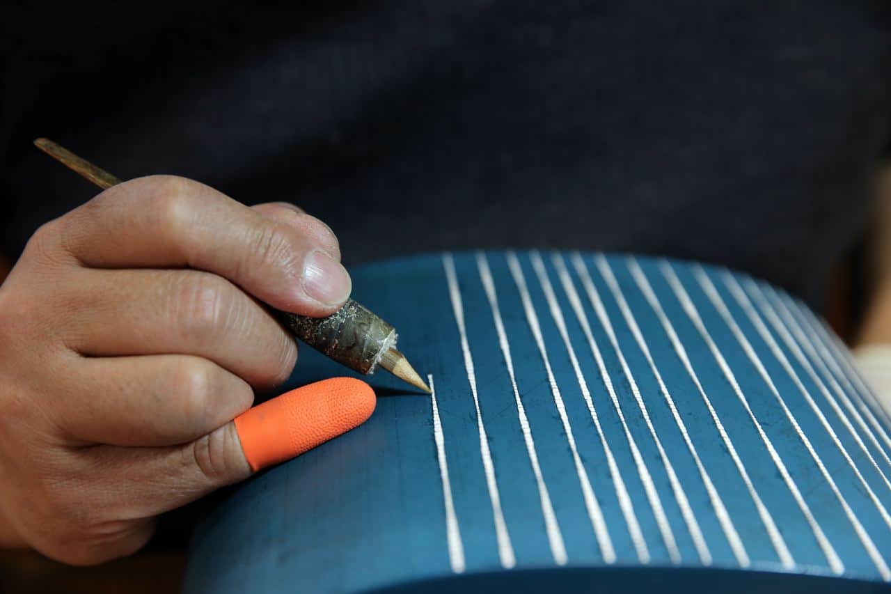 Similarly the Shiraito lacquered box by Hiroshima artisan Kinjo-Ikkokusai uses the cho-shitsu technique so that the trickling paint representing waterfalls are painstakingly built up by individually applying tiny flakes of eggshell to the lacquer base.